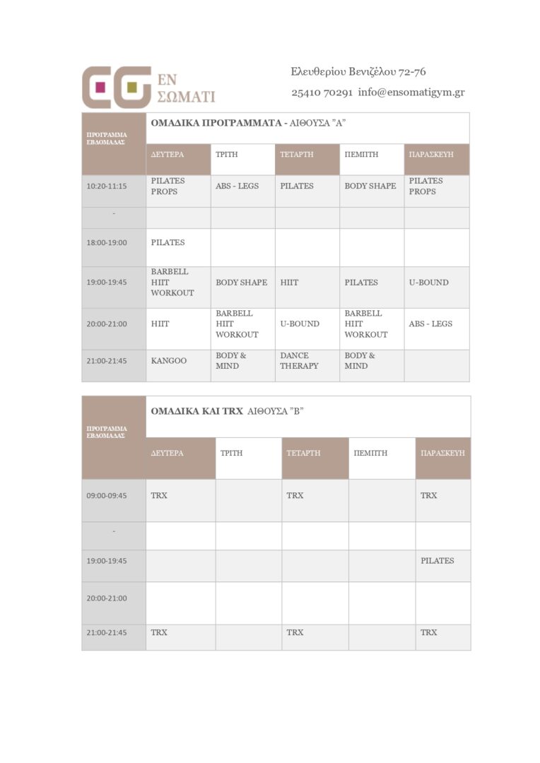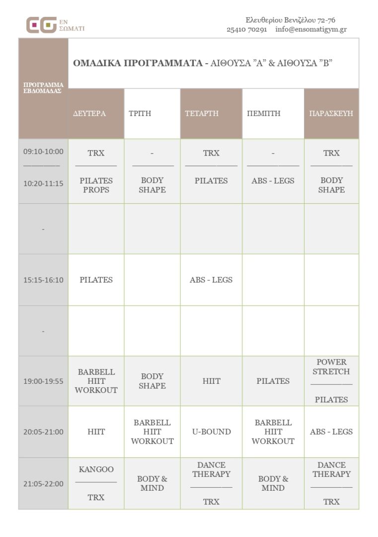 Σας ανακοινώνουμε το χειμερινό πρόγραμμα του γυμναστηρίου "εν σώματι" που θα ισχύει από Δευτέρα 13 Σεπτεμβρίου 2021. Για περισσότερες πληροφορίες επικοινωνήστε με την γραμματεία μας στο 25410-70291. Ώρες λειτουργίας γυμναστηρίου από Δευτέρα έως Παρασκευή 9:00-12:00 και 15:00-22:00. Ευχόμαστε σε όλους τους ασκούμενους μας μια χρονιά με υγεία, πολλά χαμόγελα και χωρίς άλλες αντιξοότητες!